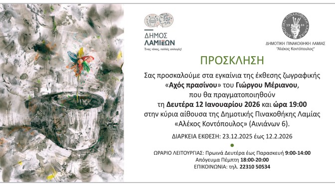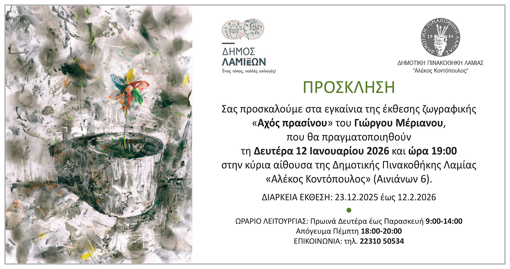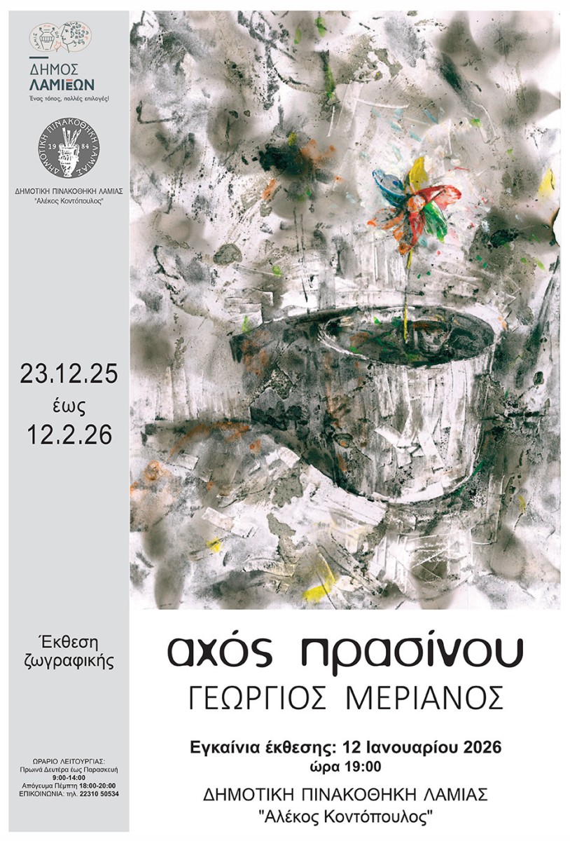 Ο Δήμος Λαμιέων και η Δημοτική Πινακοθήκη Λαμίας «Αλέκος Κοντόπουλος» διοργανώνουν Έκθεση Ζωγραφικής του εικαστικού Γιώργου Μέριανου, με τίτλο: «Αχός Πρασίνου» στην κύρια αίθουσα της Δημοτικής Πινακοθήκης Λαμίας «Αλέκος Κοντόπουλος», από τις 23 Δεκεμβρίου 2025 έως τις 12 Φεβρουαρίου 2026.