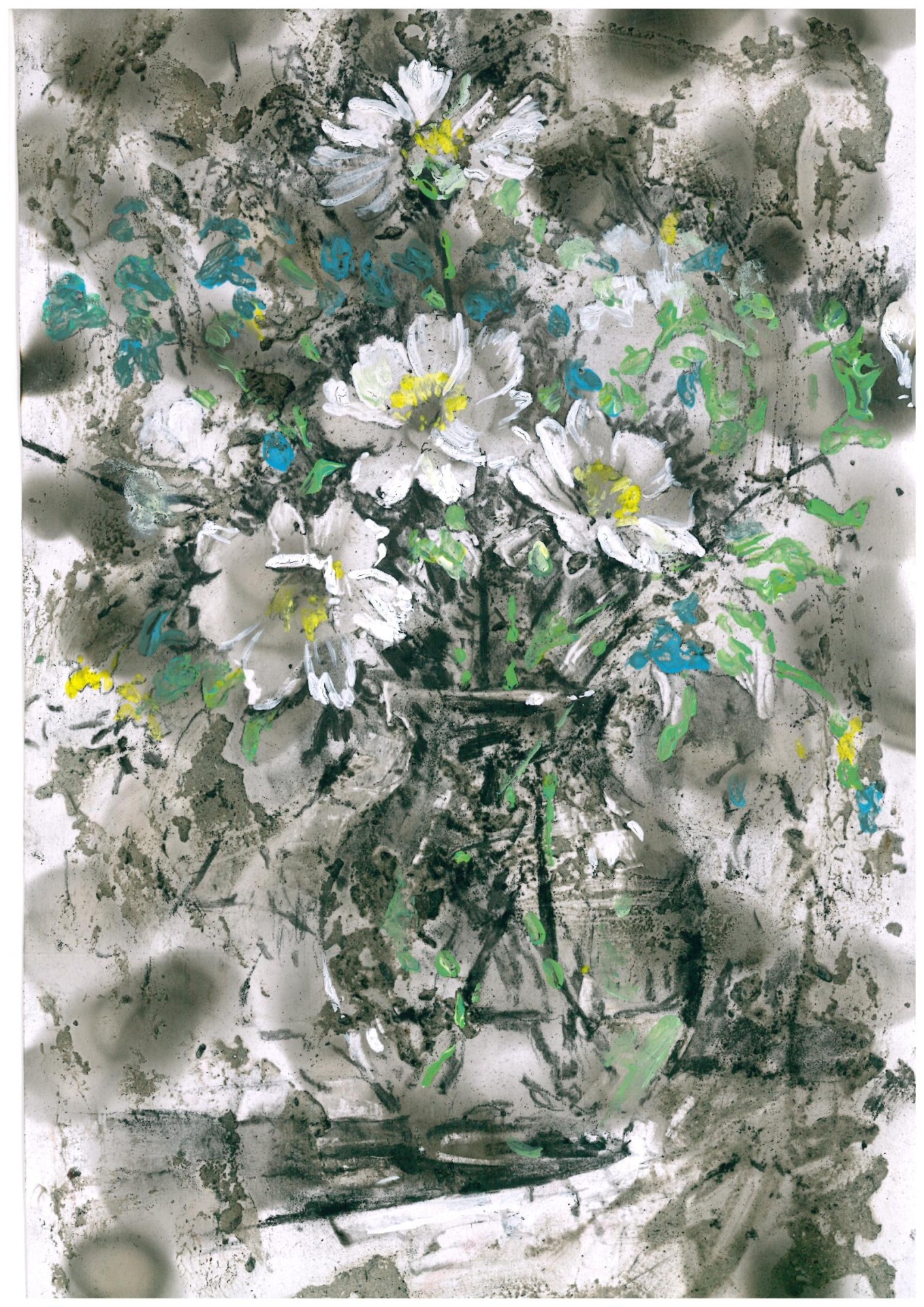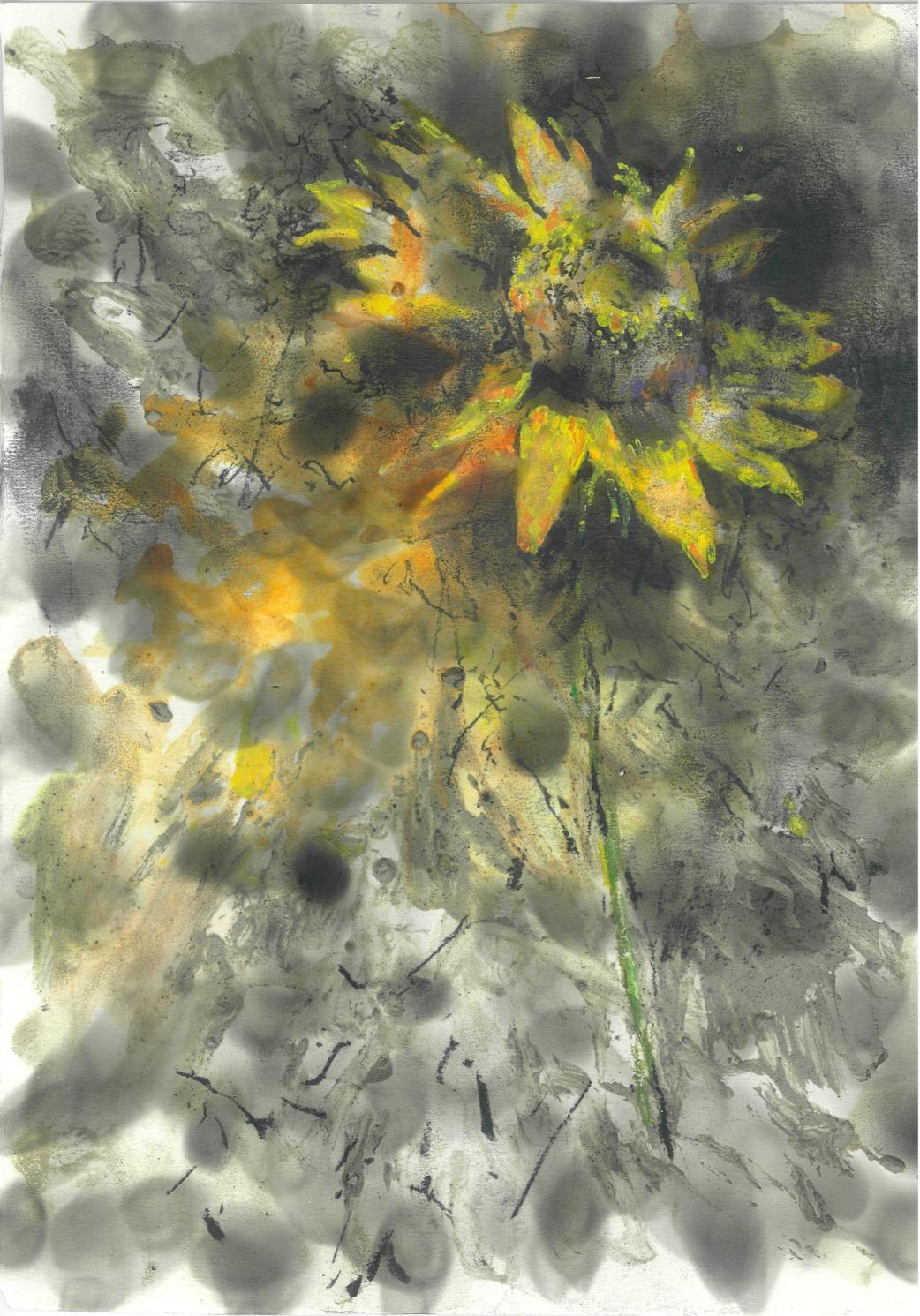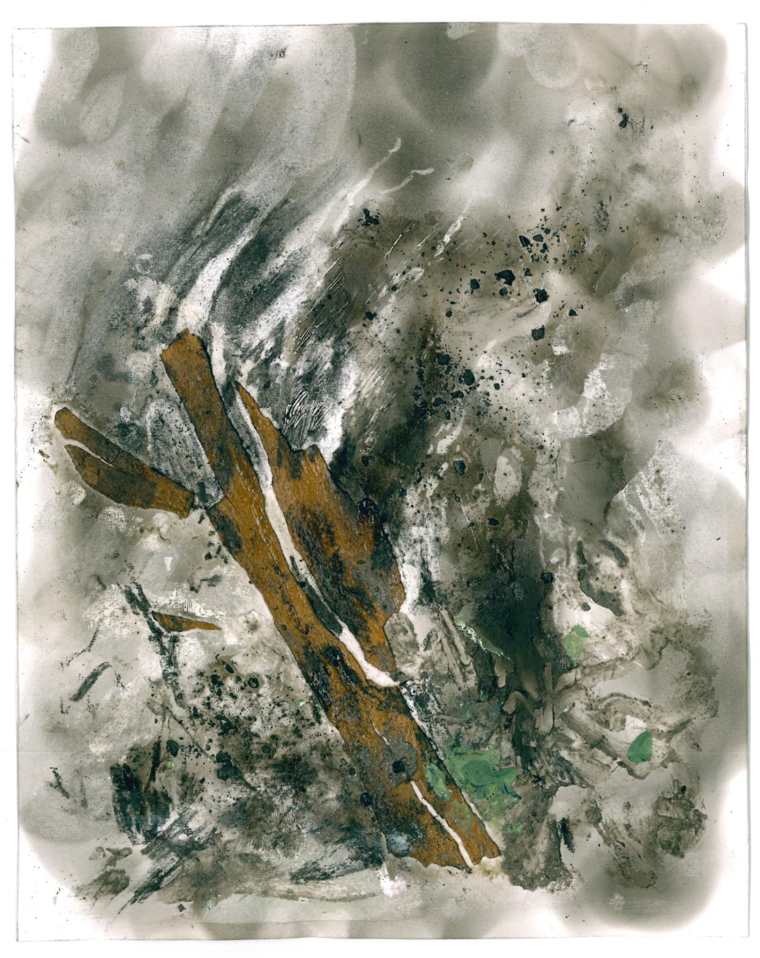 Ενώ βιώνουμε την καταστροφή και την απώλεια, εμφανίζονται ενεργά σημεία που θυμίζουν τη ζωή∙ που δηλώνουν ταυτόχρονα την παρουσία και την απουσία. Η ζωγραφική επιφάνεια μετατρέπεται σε πεδίο καταστροφής και δημιουργίας. Το κάψιμο του χαρτιού και οι κηλίδες του καπνού μαρτυρούν πως οι μορφές γεννιούνται μέσα από μια ασταθή διαδικασία, πάνω σε ένα φθαρτό υλικό που απειλείται από την ίδια τη δημιουργία του. Μέσα από αυτήν την πράξη, αναδύεται η ιδέα της μετάβασης, της αναγέννησης».