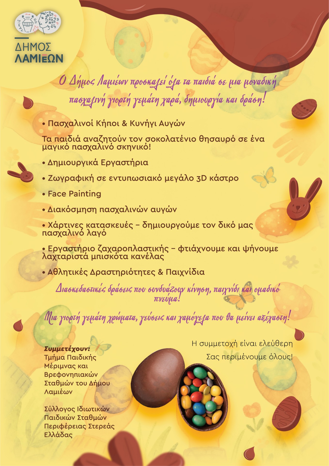 Ο Δήμος Λαμιέων διοργανώνει μια ξεχωριστή πασχαλινή εκδήλωση αφιερωμένη στα παιδιά και τις οικογένειές τους, γεμάτη παιχνίδι, δημιουργία και χαρά.
