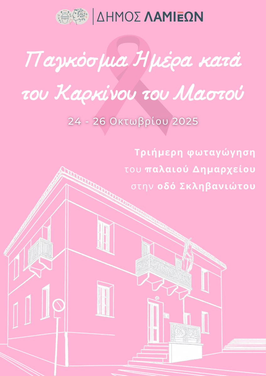 Ο Δήμος Λαμιέων συμμετέχει ενεργά στις δράσεις ενημέρωσης και ευαισθητοποίησης, που πραγματοποιούνται σε όλο τον κόσμο, προχωρώντας στη φωταγώγηση του παλαιού Δημαρχείου, στην οδό Σκληβανιώτου σε ροζ χρώμα, από την Παρασκευή 24 έως και την Κυριακή 26 Οκτωβρίου 2025.