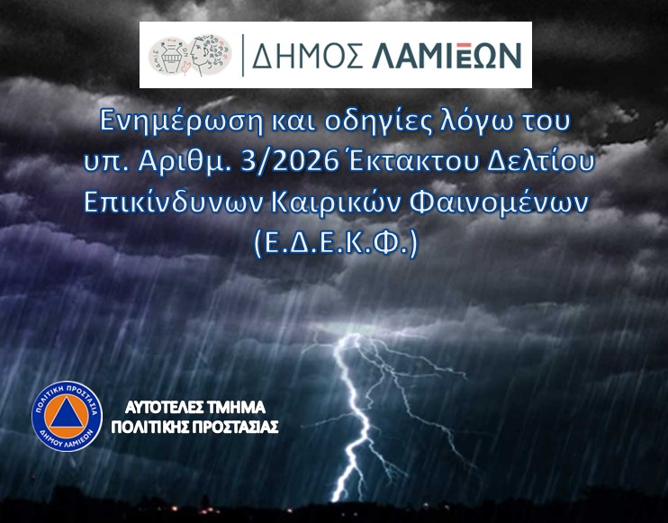 Ο Δήμος Λαμιέων και οι Υπηρεσίες που εμπλέκονται σε έργα και δράσεις για την αντιμετώπιση κινδύνων από επικίνδυνα καιρικά φαινόμενα έχουν τεθεί σε κατάσταση ετοιμότητας βάσει του σχεδιασμού τους, προκειμένου να αντιμετωπιστούν πιθανά προβλήματα που θα δημιουργηθούν από την εκδήλωση των φαινομένων, ειδικότερα δε σε επιβαρυμένες περιοχές από τις προηγούμενες καταστροφές.