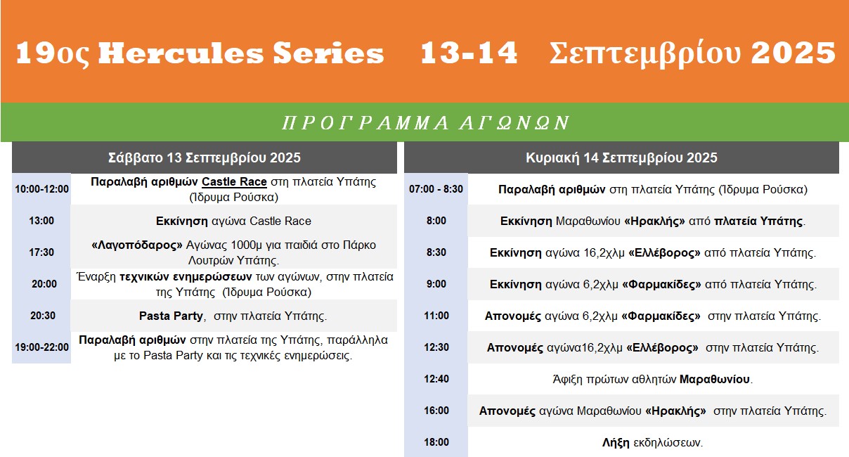 Ο 19ος Hercules Series διοργανώνεται από τον Σύλλογο Δρομέων Φθιώτιδας «Τραχίνα», σε συνεργασία με το Δήμο Λαμιέων και την Περιφέρεια Στερεάς Ελλάδας.