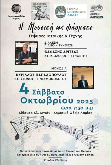Μια ξεχωριστή εκδήλωση διοργανώνουν ο Δήμος Λαμιέων και το Δημοτικό Ωδείο Λαμίας, σε συνεργασία με τη Βιβλιοθήκη του Γενικού Νοσοκομείου Λαμίας, το Σάββατο 4 Οκτωβρίου 2025 και ώρα 19:30, στην αίθουσα συναυλιών «Αλέξανδρος Αινιάν» του Δημοτικού μας Ωδείου.