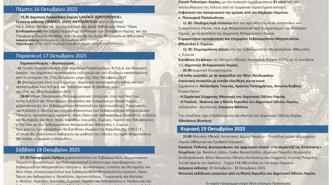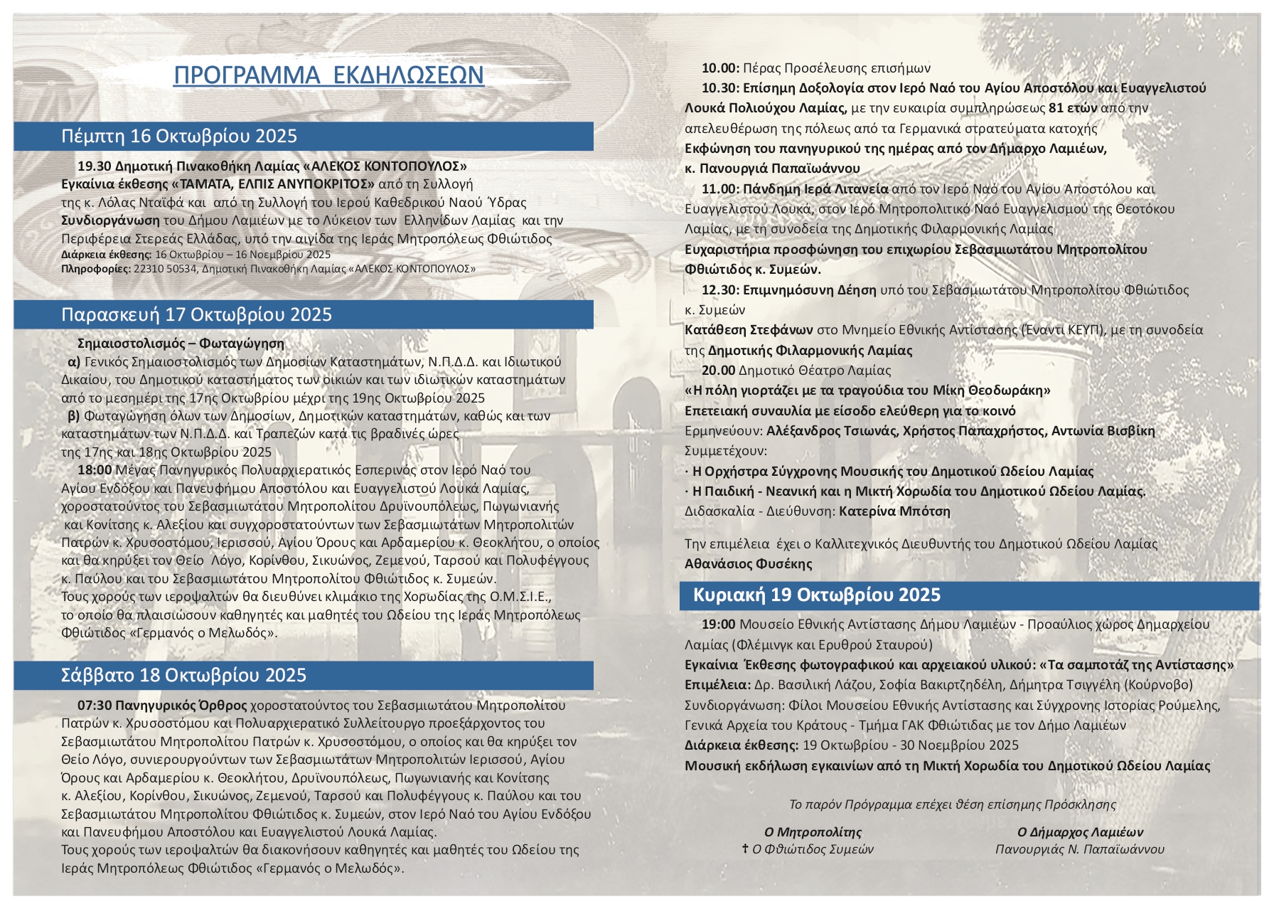Για την επέτειο της 18.10.2025 τοπικής θρησκευτικής εορτής του Ευαγγελιστού Λουκά της Λαμίας και Επέτειο της Απελευθέρωσης της πόλης θα πραγματοποιηθούν οι παρακάτω εορταστικές εκδηλώσεις: