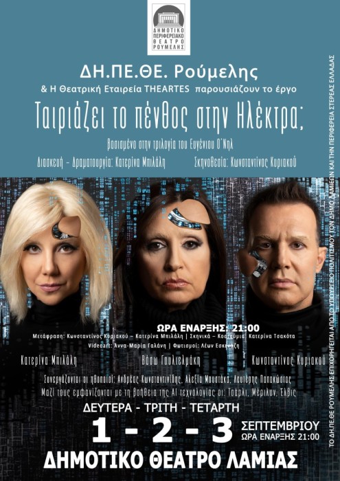 Το ΔΗΠΕΘΕ Ρούμελης στο πλαίσιο της Κεντρικής Σκηνής και η Θεατρική Εταιρεία THEATRES, παρουσιάζουν την παράσταση «Ταιριάζει το πένθος στην Ηλέκτρα;» τη Δευτέρα 1, την Τρίτη 2 και την Τετάρτη 3 Σεπτεμβρίου 2025, στις 21:00 στο Χειμερινό Δημοτικό Θέατρο Λαμίας.