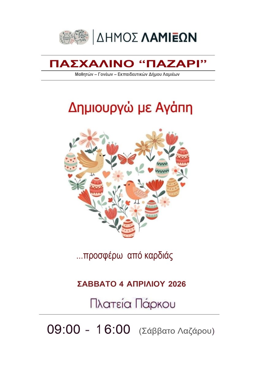 Ο Δήμος Λαμιέων προσκαλεί μικρούς και μεγάλους να επισκεφθούν το 4ο Πασχαλινό Παζάρι και να στηρίξουν αυτή την όμορφη πρωτοβουλία, τα έσοδα της οποίας θα διατεθούν προς όφελος των μαθητών, καθώς και για φιλανθρωπικούς σκοπούς.