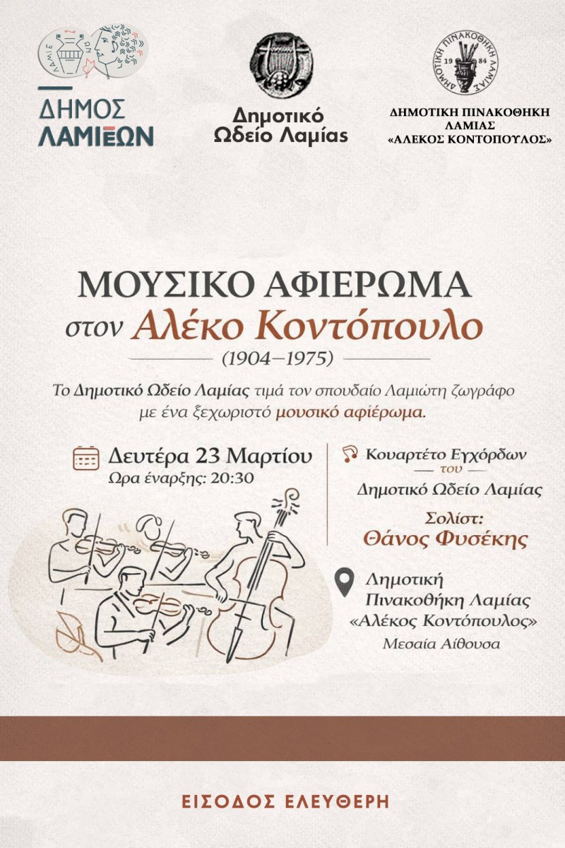 Τη Δευτέρα 23 Μαρτίου 2026 και ώρα 20.30 το κουαρτέτο εγχόρδων του Δημοτικού Ωδείου Λαμίας, με σολίστ τον Θάνο Φυσέκη, θα πραγματοποιήσει μουσικό αφιέρωμα στον Λαμιώτη ζωγράφο Αλέκο Κοντόπουλο (1904-1975) στη μεσαία αίθουσα της Δημοτικής Πινακοθήκης Λαμίας «Αλ. Κοντόπουλος».